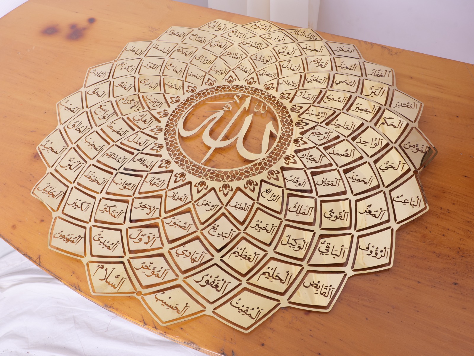 Elevate your home with the divine beauty of the Islam Metal Allah 99 Names Wall Art – a stunning piece of Islamic décor designed to bring peace, spirituality, and elegance to any space. Crafted with precision from high-quality metal, this 3D Arabic wall décor showcases the 99 beautiful names of Allah (Asma Ul Husna) in an intricate and timeless design.